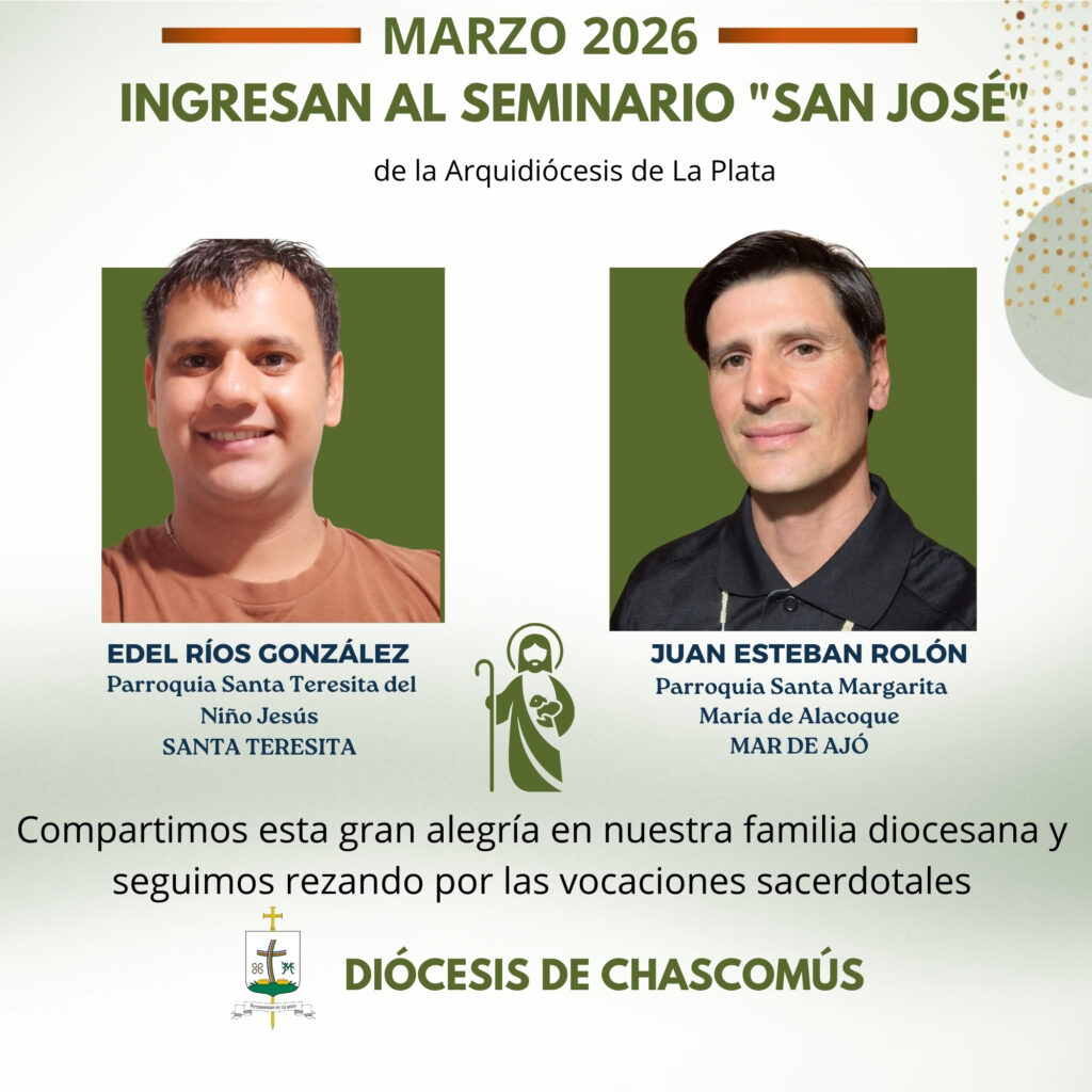 Con profunda alegría compartimos que dos jóvenes de nuestra diócesis iniciarán su camino de formación ingresando al Seminario Arquidiocesano de La Plata, respondiendo generosamente al llamado del Señor.Agradecemos especialmente al padre Miguel Ángel Tamagno y al padre Luis Horacio Aguirre por el cercano acompañamiento pastoral brindado en este proceso de discernimiento de estos jóvenes.Como comunidad diocesana, animamos a todos a continuar rezando por las vocaciones sacerdotales, para que el Señor siga llamando y suscite corazones disponibles para el servicio de la Iglesia.